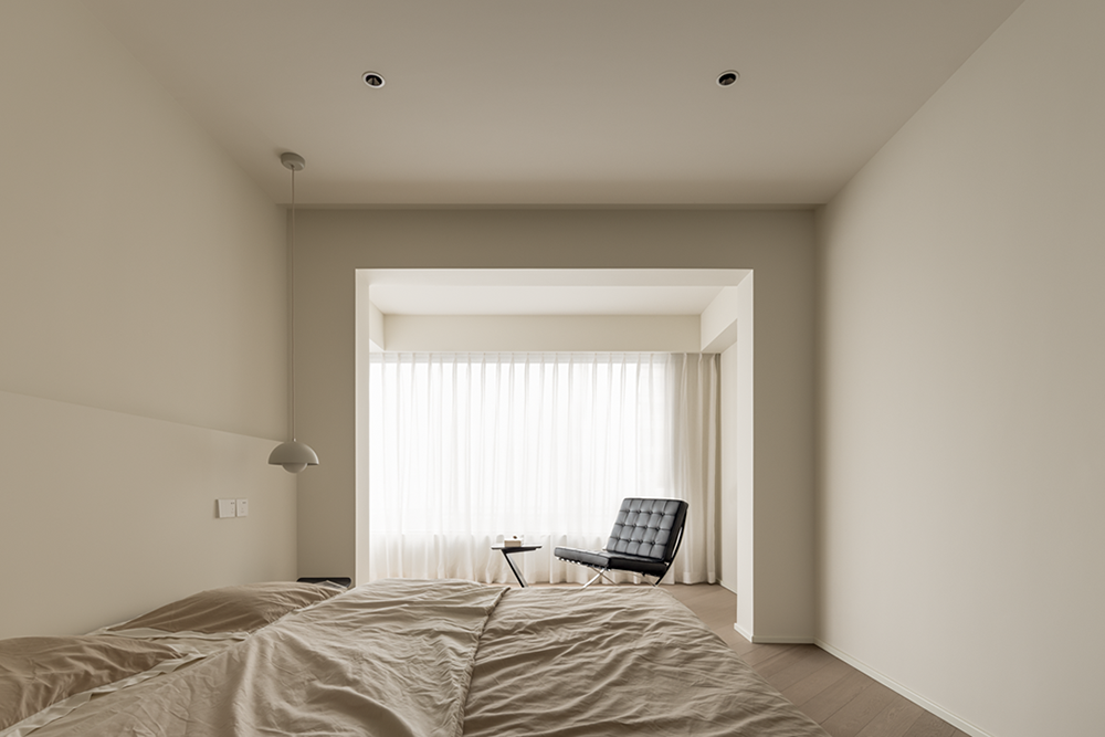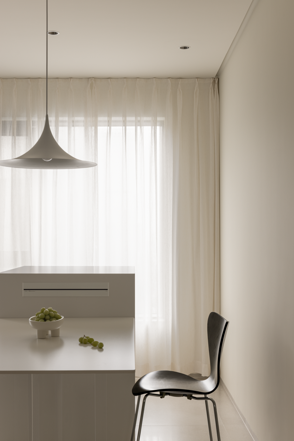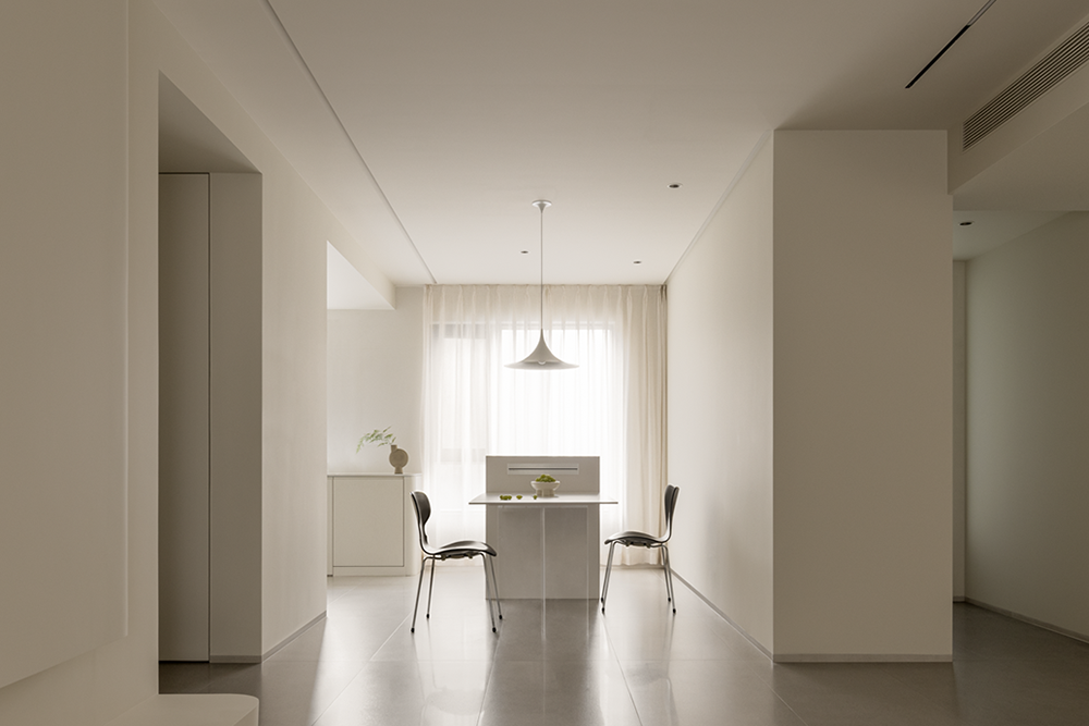 岛台餐桌与橱柜强化餐厨收纳所需,精简、纯粹的体块将温柔尺度化解,留白之处更透彻地感知生活,平仄时空,应邀而来,落落大方。