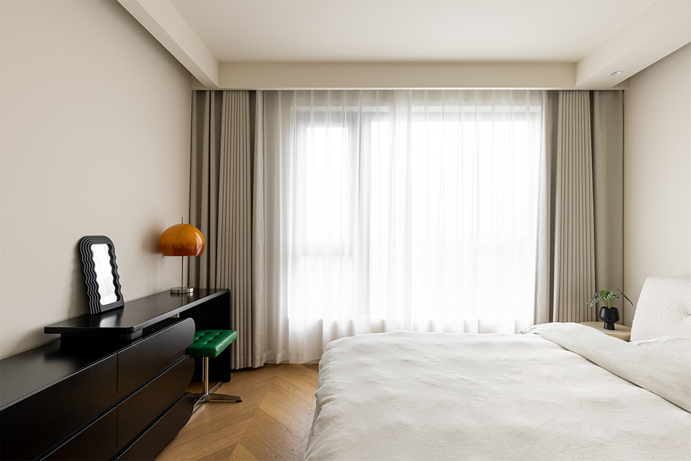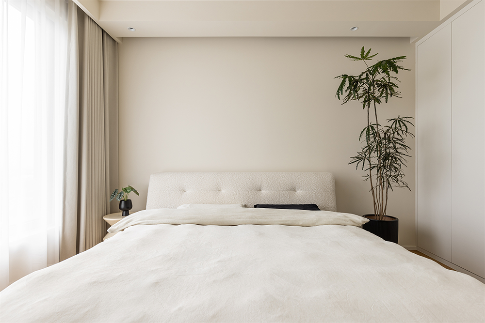 墙壁,窗帘,床品,采用同色系相互搭配为主。营造出牛奶和咖啡融合后的色调,充满温度,打造了静谧,放松的入睡空间。