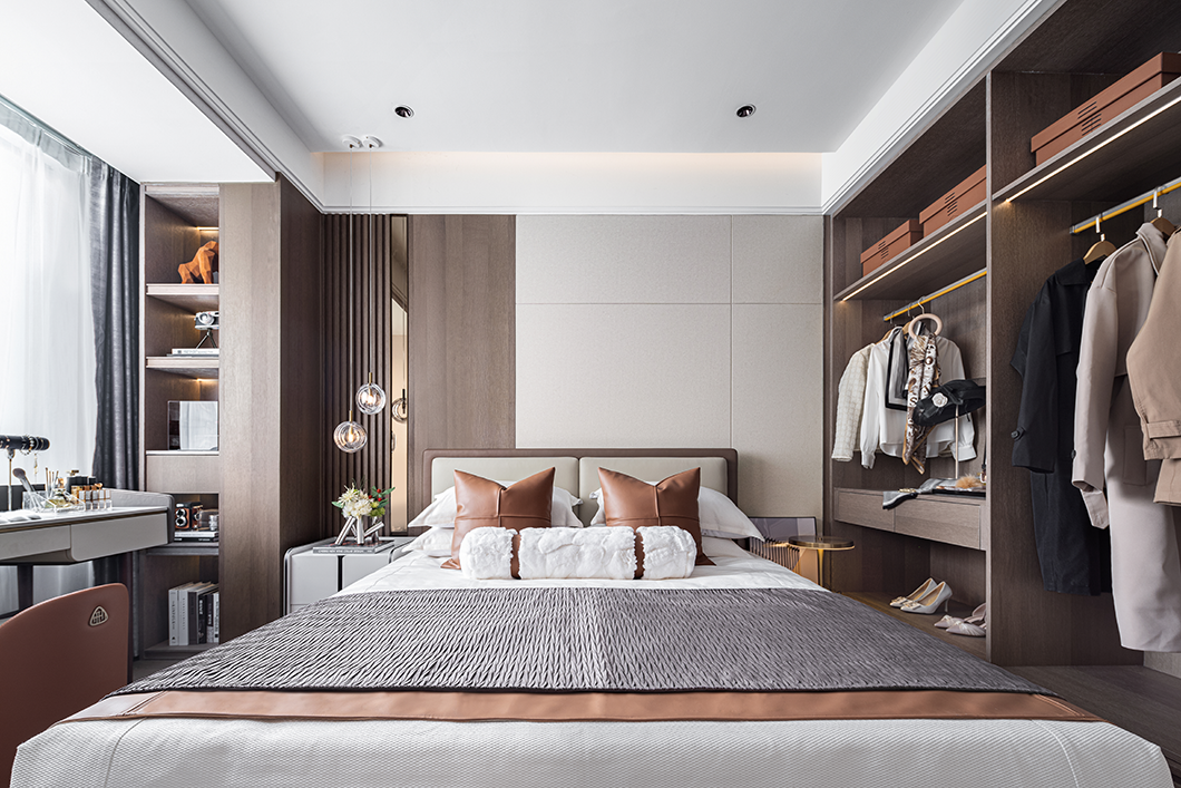 主卧空间里交融着静谧的氛围与摩登的质感,柔和不乏雅致的高级感,将装饰与生活空间相融,根据空间使用者的兴趣品味,造就审美独特的现代轻奢风格。