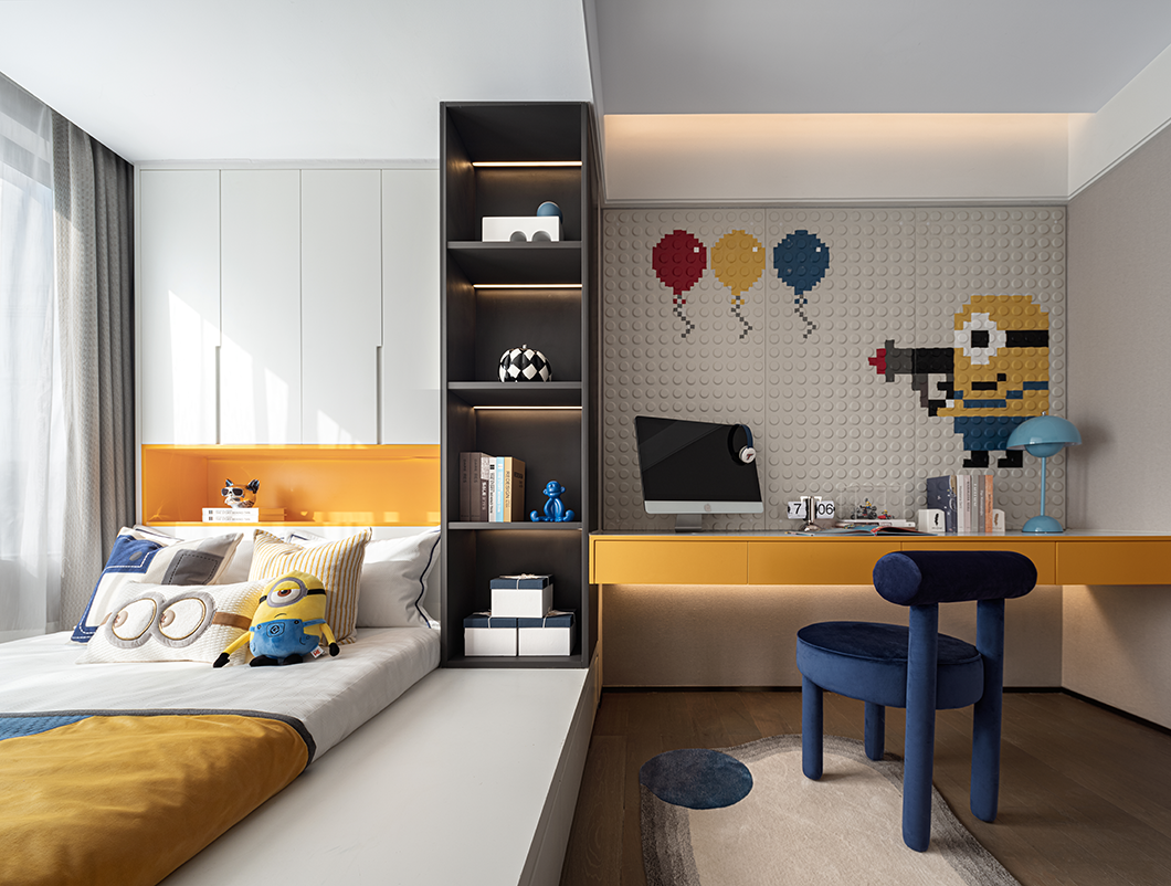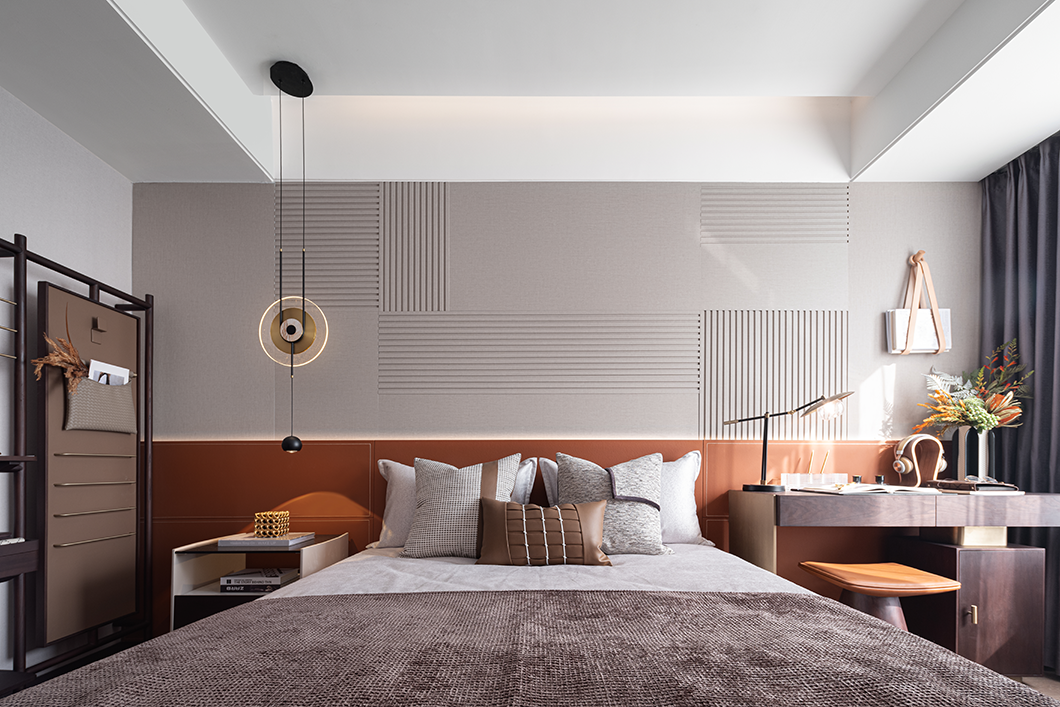 次卧显露安静沉稳的气质整体空间的风格大气精致,设计师用艺术的手法给卧室赋予温度,在低饱和度的素色中,加入时尚的橙色,增加活力动感。
