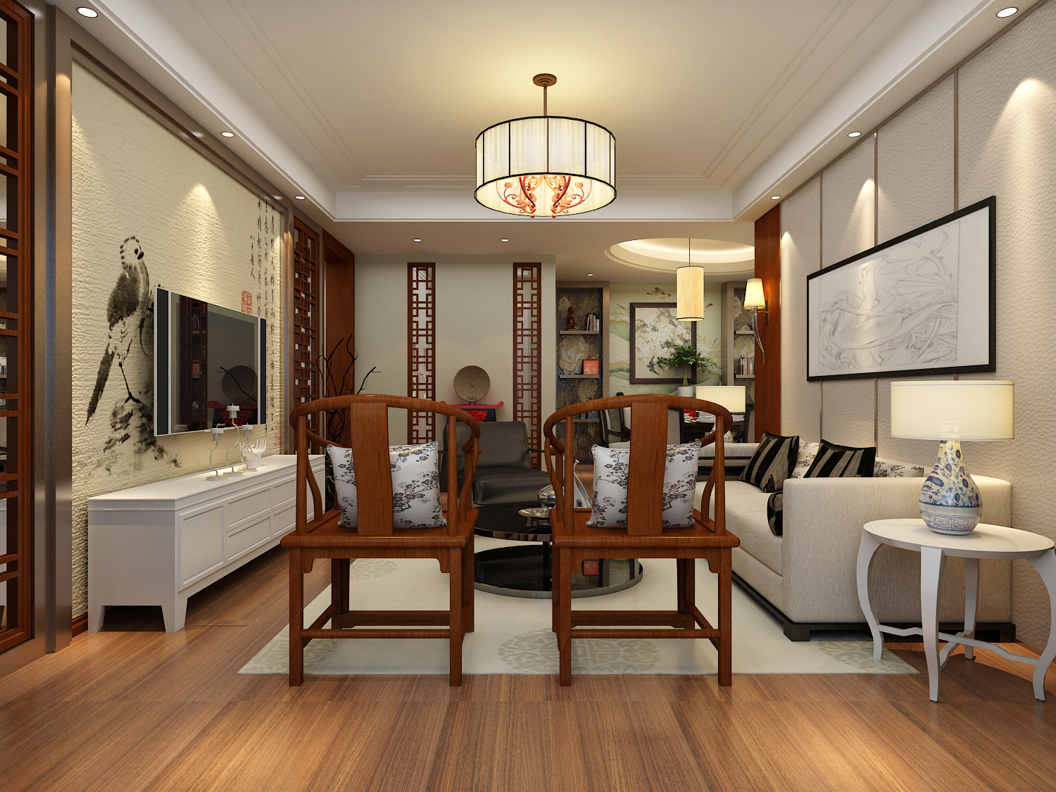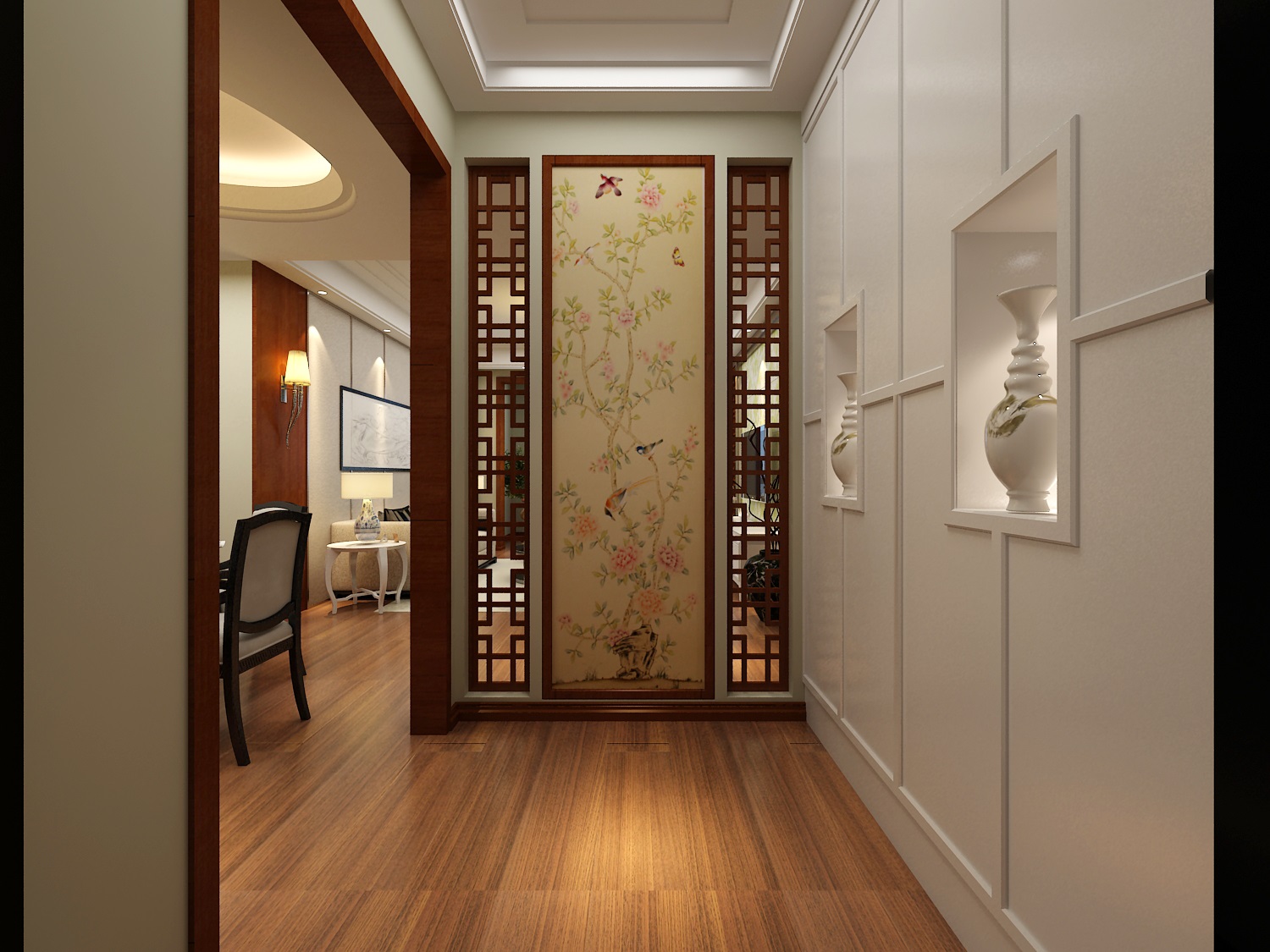 在设计上,根据屋主本身的独特气质,所以先从大的格局上改变再在细节上进行添置;入户正对面的墙体拉长玄关视觉。竖厅变成横厅打开原本局促的格局,每一个角落都带有一个小景,步步都有现代中式独特的韵味。
