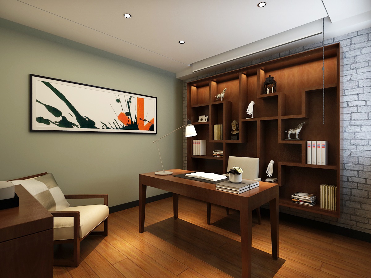 书房选择在客厅,空间更具开阔性,在实现收纳的同时还变成沙发的背景墙。并巧用石膏线代替护墙。