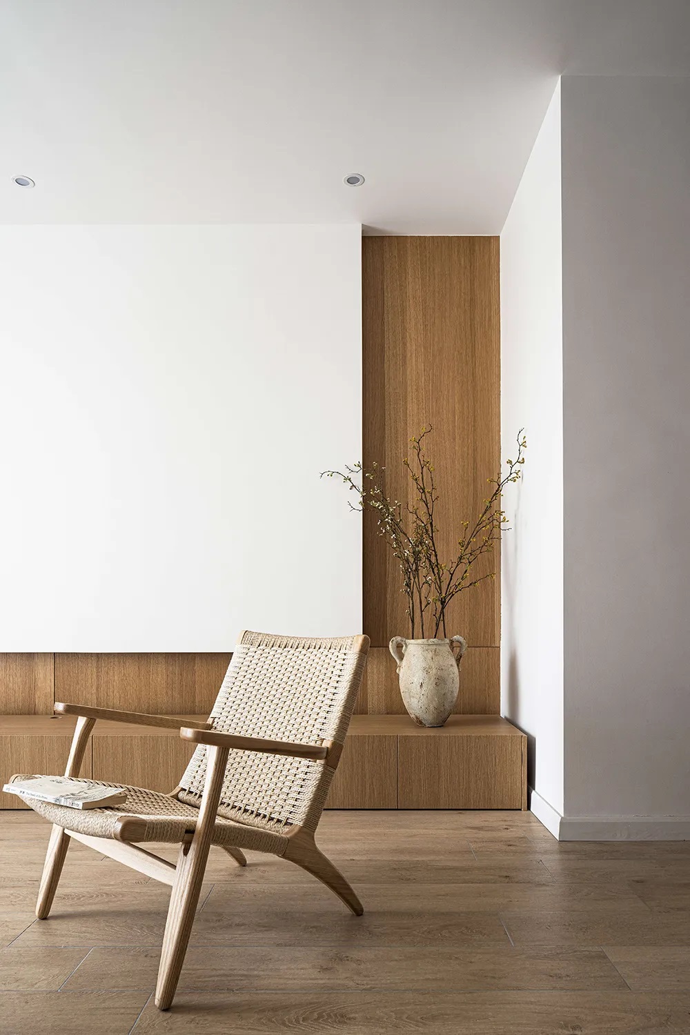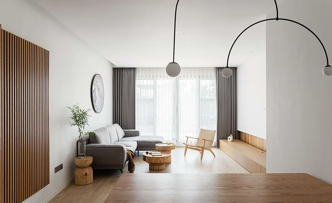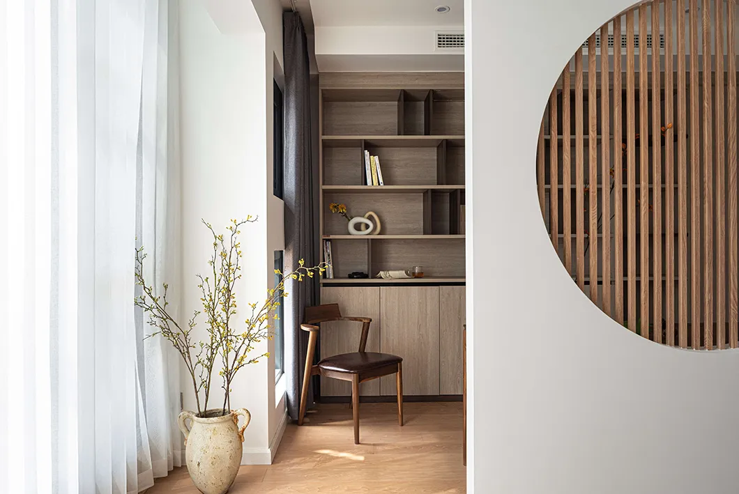 原木新中式装修风格,留白客厅超质朴纯粹,书房卧室隔“窗”相望,纯粹的空间让人内心平和又放松,去除浮躁,回归生活本质。