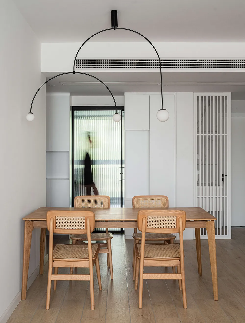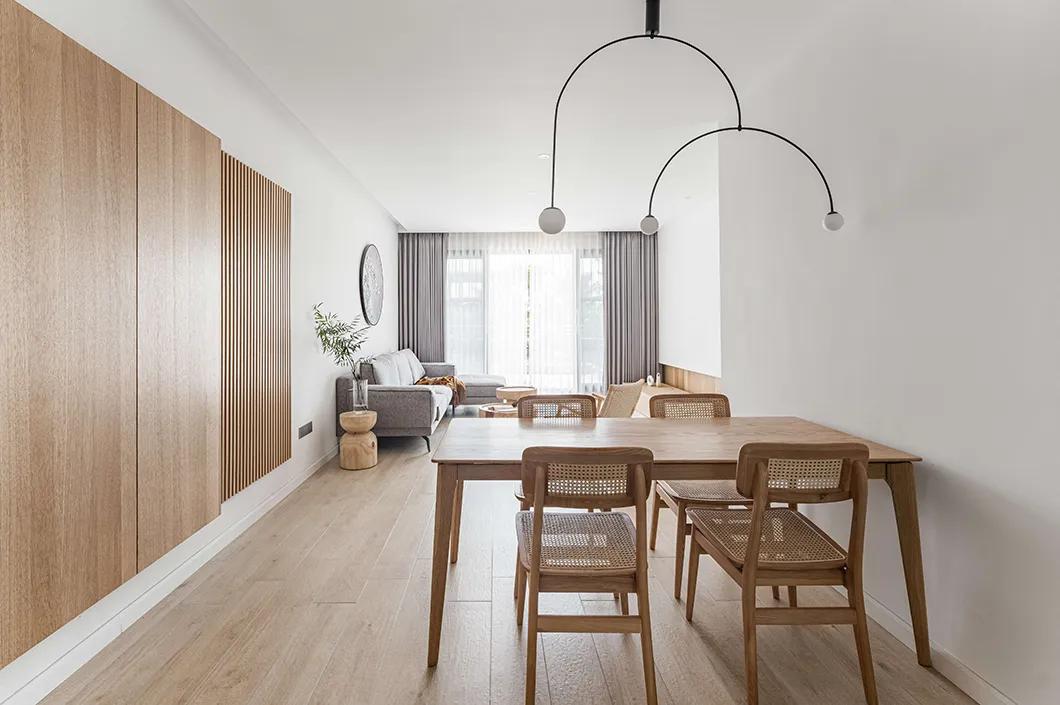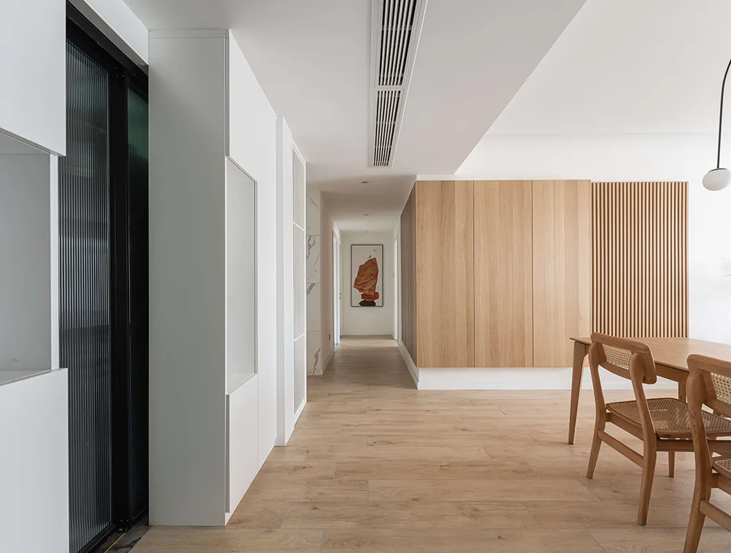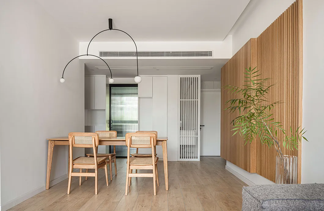 餐厅的设计采用天然材料,用最柔和的颜色,最真实的纹理,表达最淳朴的生活。厨房使用了长虹玻璃推拉门。让两个不同的空间之间有了对话与互动。入户左手为玄关换鞋区,一镜到底的空间通透感,让空间倍感舒爽与透亮。