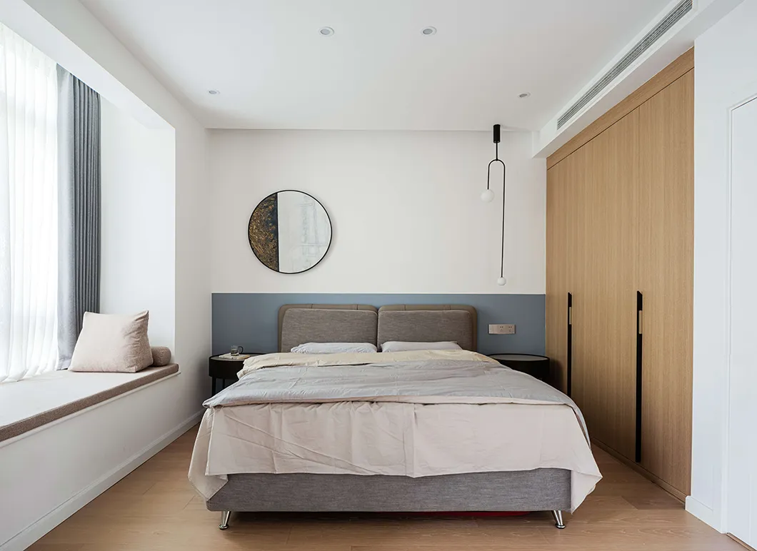 卧室的设计,一张大床、一面木墙,以及斑驳梦幻的光影交织,便将恬静的氛围装点得甚是迷人。书桌与主卧床体相隔而望,似透非透的朦胧感增加了空间的美感。一轮圆月再加一本好书,就可以度过惬意的闲暇时光。