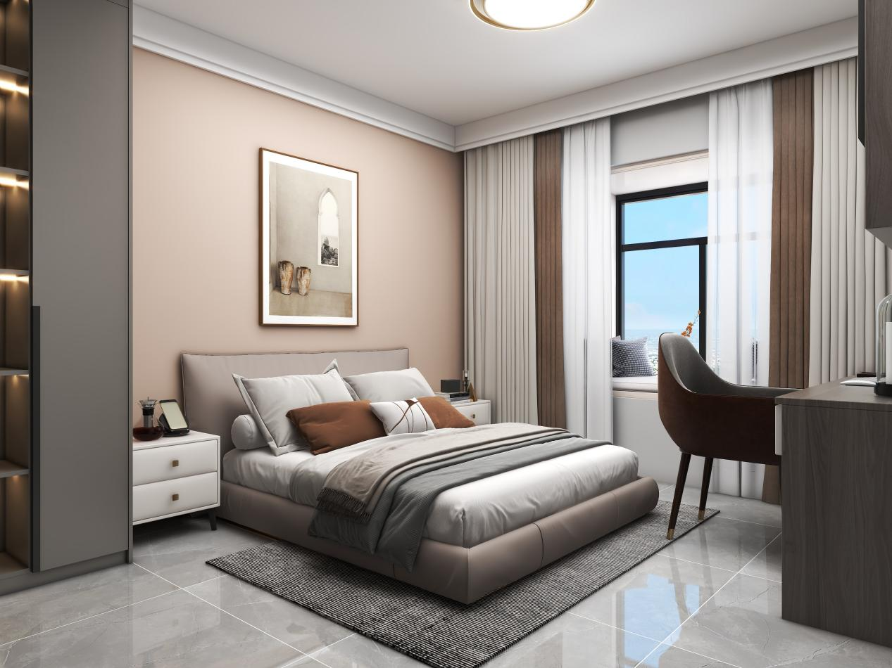 卧室床头用漆调色。简约大方,不失美感。转角衣柜合理利用空间,大大增加了卧室衣物的收纳。配以简约的梳妆台,可以美美的化个妆。