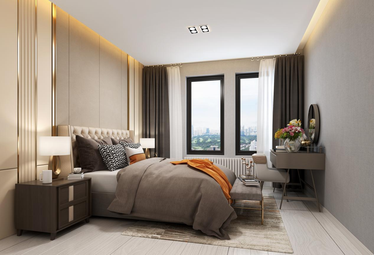 在设计上强调功能性,结构和形式的完整,更追求材料、技术、空间的表现深度与精确,运用最少的设计语言,表达出最深的设计内涵。删繁就简,去伪存真,以色彩的高度凝练和造型的极度简洁,在满足功能需要的前提下,卫生间做了一个简单的干湿分离,整体颜色以浅色为主,主卧在灰色调的空间基础,布置上灰色布艺床铺,摆上显眼活泼的当下流行的爱马仕橙色作为装饰,床头墙做了一个简单的硬包处理,让简约的空间也显得跳跃自然。