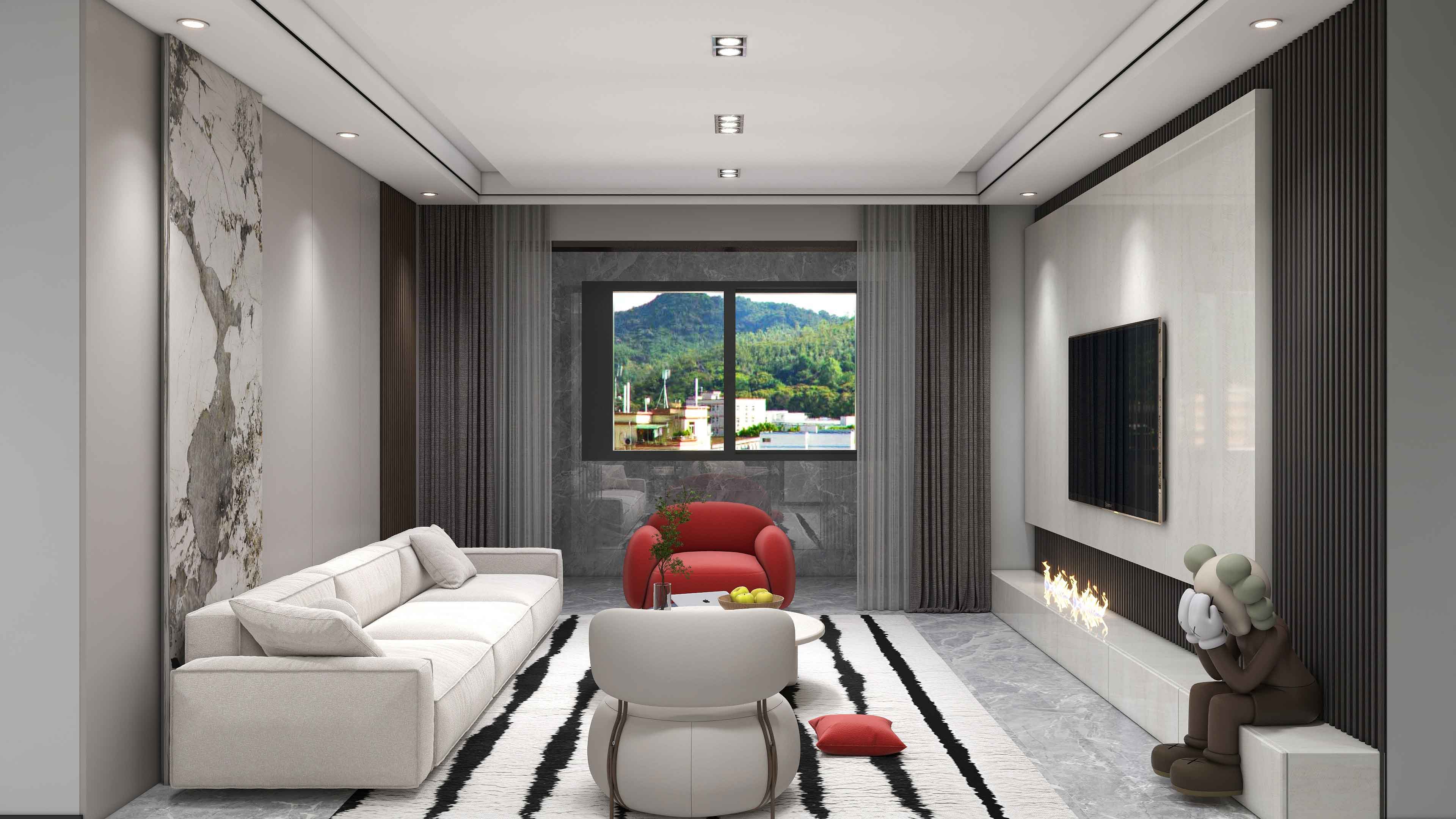 以黑色白色为主色调,空间中的中国红沙发成为空间的整体提亮及焦点,顶面采用无主灯设计,顶面干净整洁,重点照明和氛围灯光全部具备,在需要的时候可以变为家庭影音室。